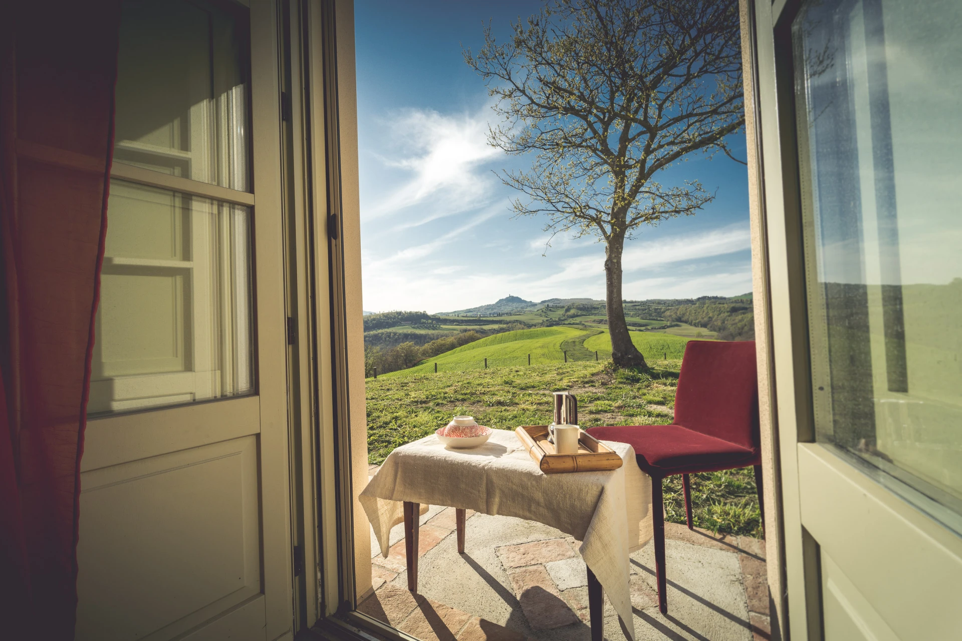 Beide vakantiehuizen met gemeenschappelijk privézwembad voor 8 personen liggen op de top van een heuvel en genieten van adembenemende uitzichten over de Amiata berg en Radicofani in het hartje van Toscane.