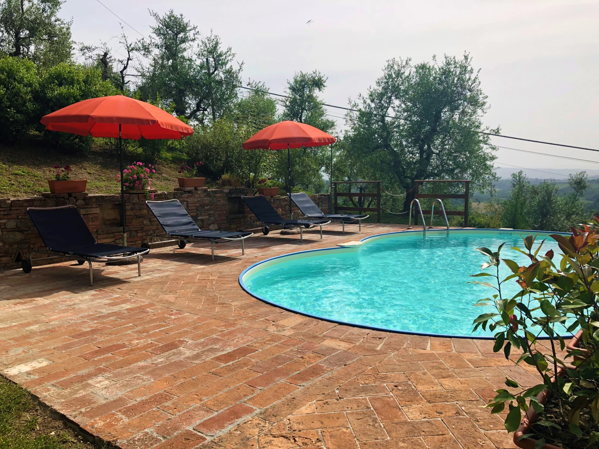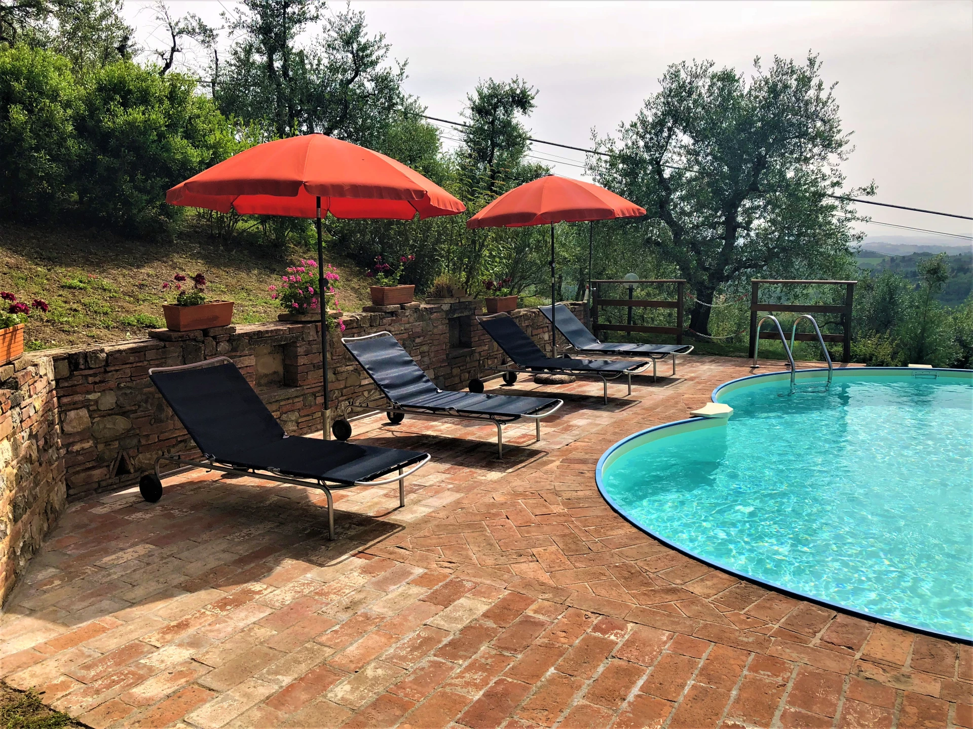 Het panoramische zwembad (7,25x4,60m - diepte 1,10m) is de enige gemeenschappelijke ruimte en biedt een adembenemend uitzicht over het omliggende landschap. Omringd door bloemen, aromatische planten en olijfbomen nodigt het uit tot ontspanning, terwijl ligstoelen en parasols comfort bieden op de zonnigste uren van de dag. De ruime tuin en buitenruimtes zijn ideaal om in open lucht te eten, te lezen of gewoon te genieten van de natuur. Een ruim terras en barbecue zorgt voor het ultieme vakantiegevoel. Hun kleurrijke moestuin levert het hele jaar verse produkten