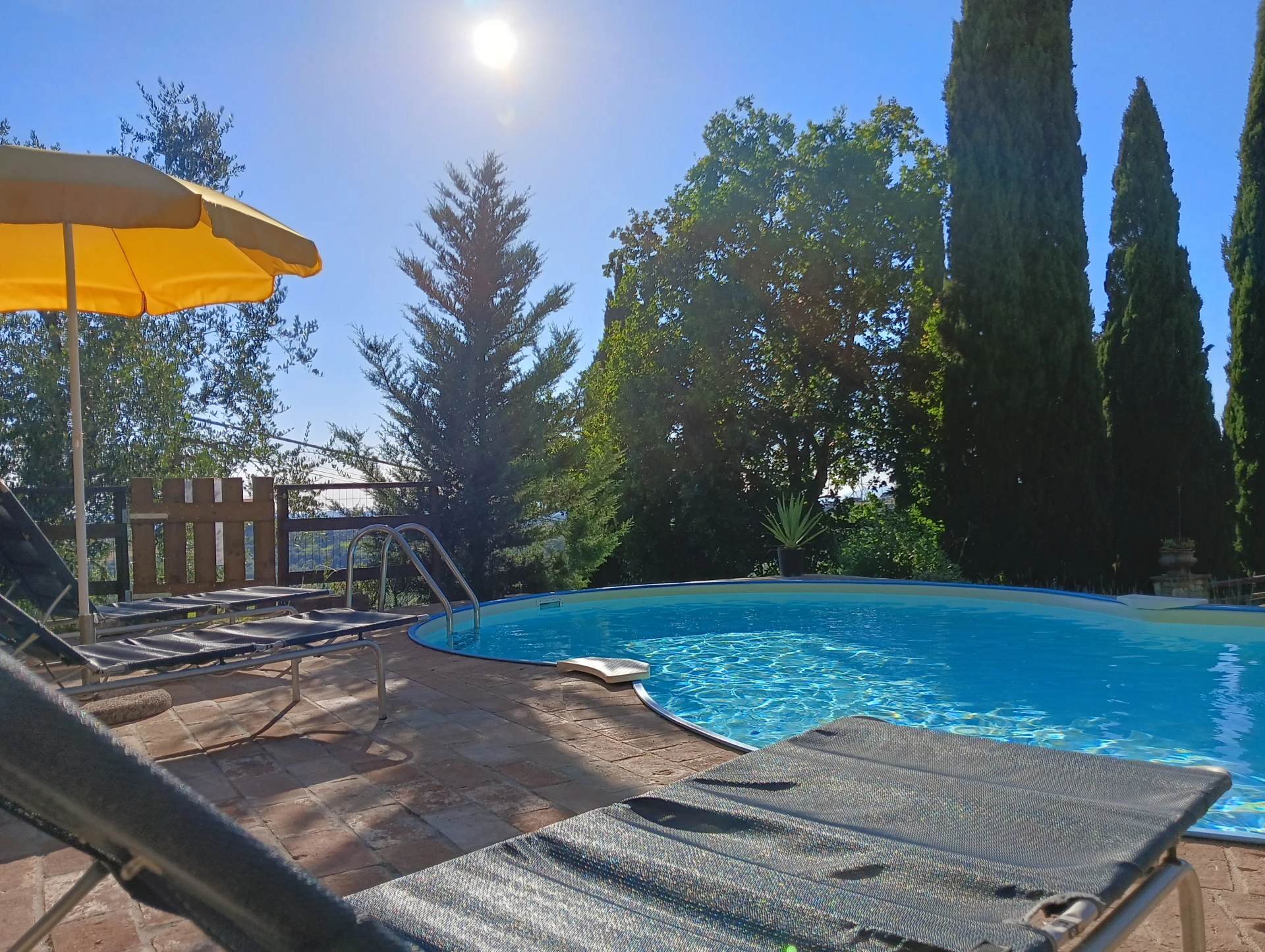 Het panoramische zwembad (7,25x4,60m - diepte 1,10m) is de enige gemeenschappelijke ruimte en biedt een adembenemend uitzicht over het omliggende landschap. Omringd door bloemen, aromatische planten en olijfbomen nodigt het uit tot ontspanning, terwijl ligstoelen en parasols comfort bieden op de zonnigste uren van de dag. De ruime tuin en buitenruimtes zijn ideaal om in open lucht te eten, te lezen of gewoon te genieten van de natuur. Een ruim terras en barbecue zorgt voor het ultieme vakantiegevoel. Hun kleurrijke moestuin levert het hele jaar verse produkten
