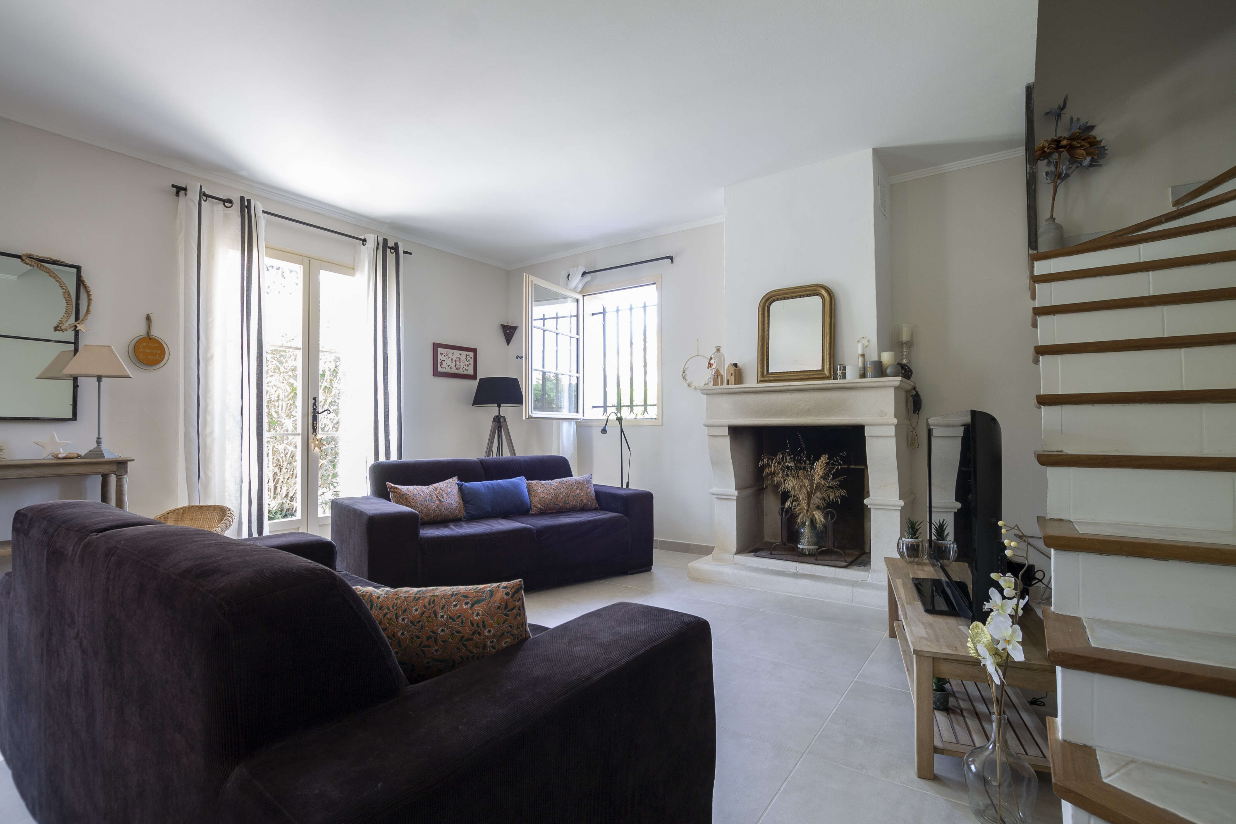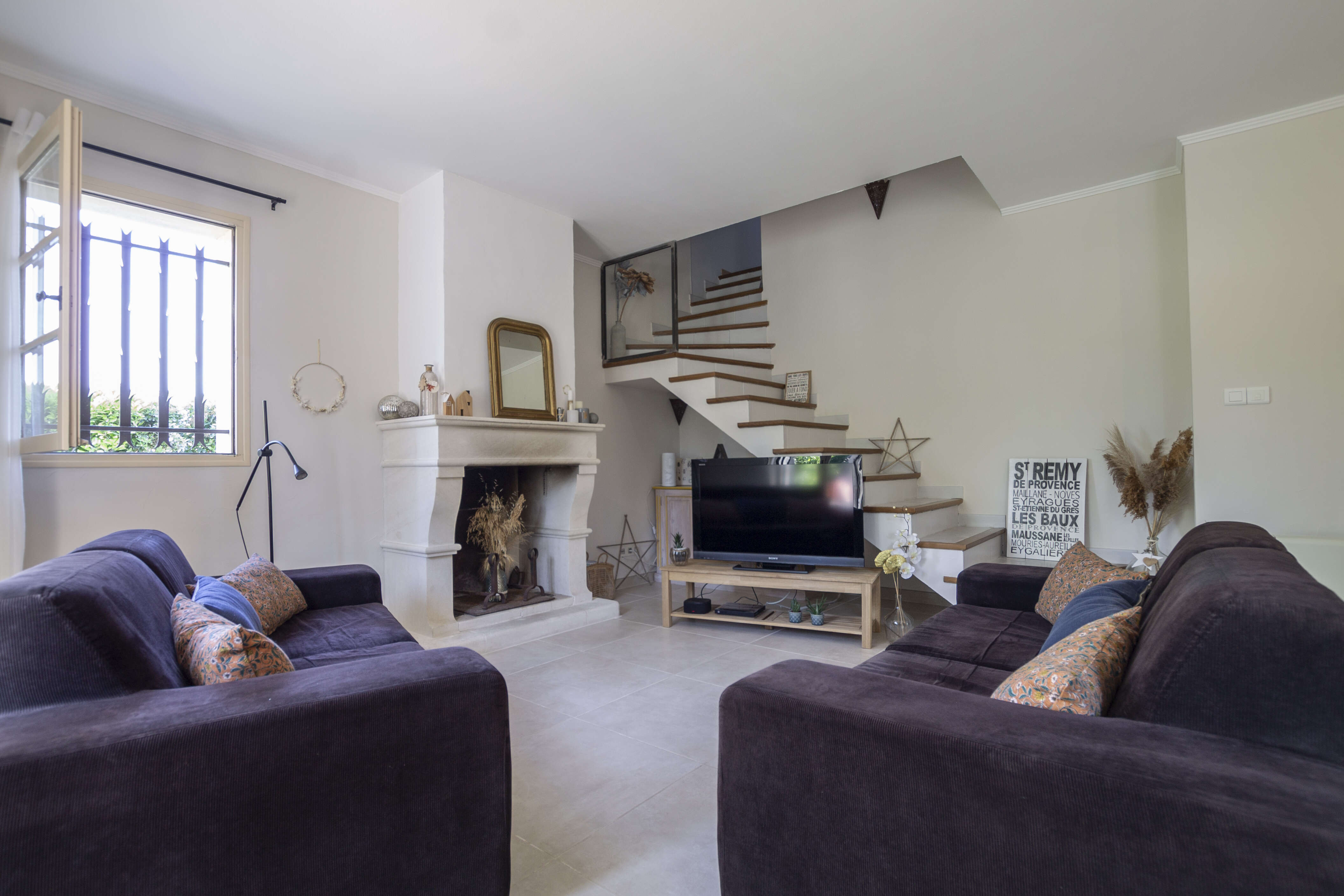 Woonkamer: TV , openhaard , airco