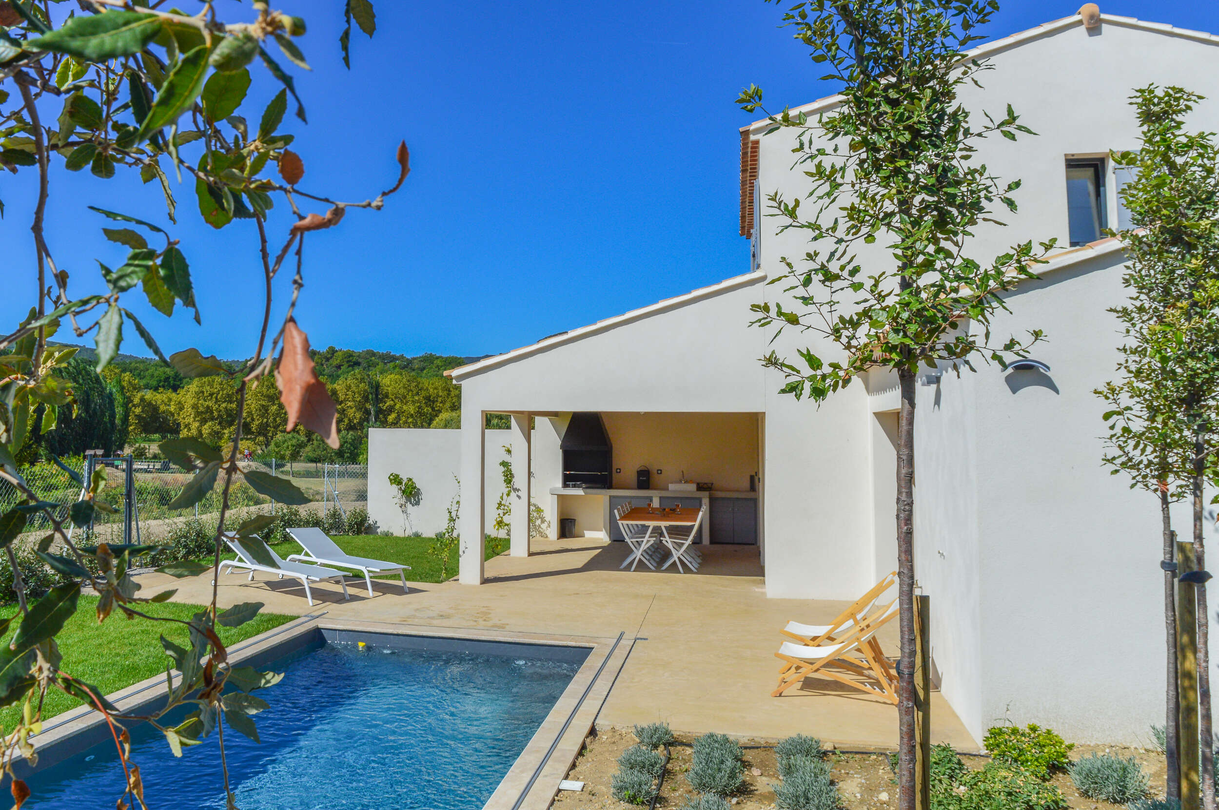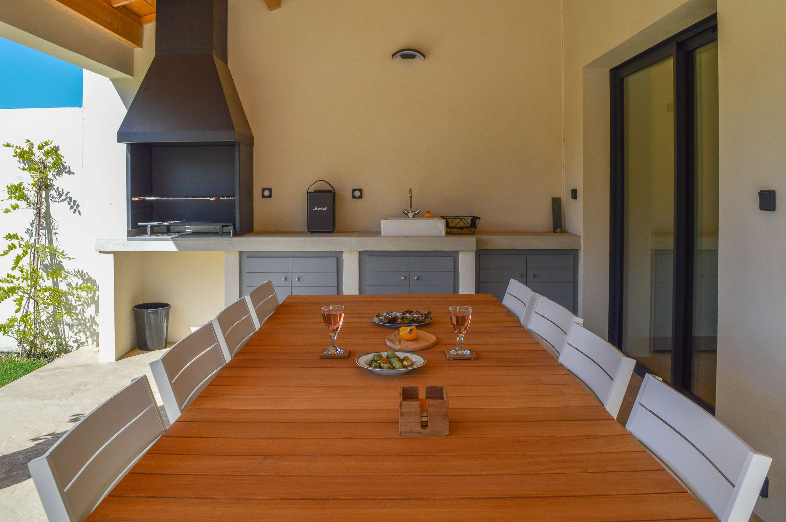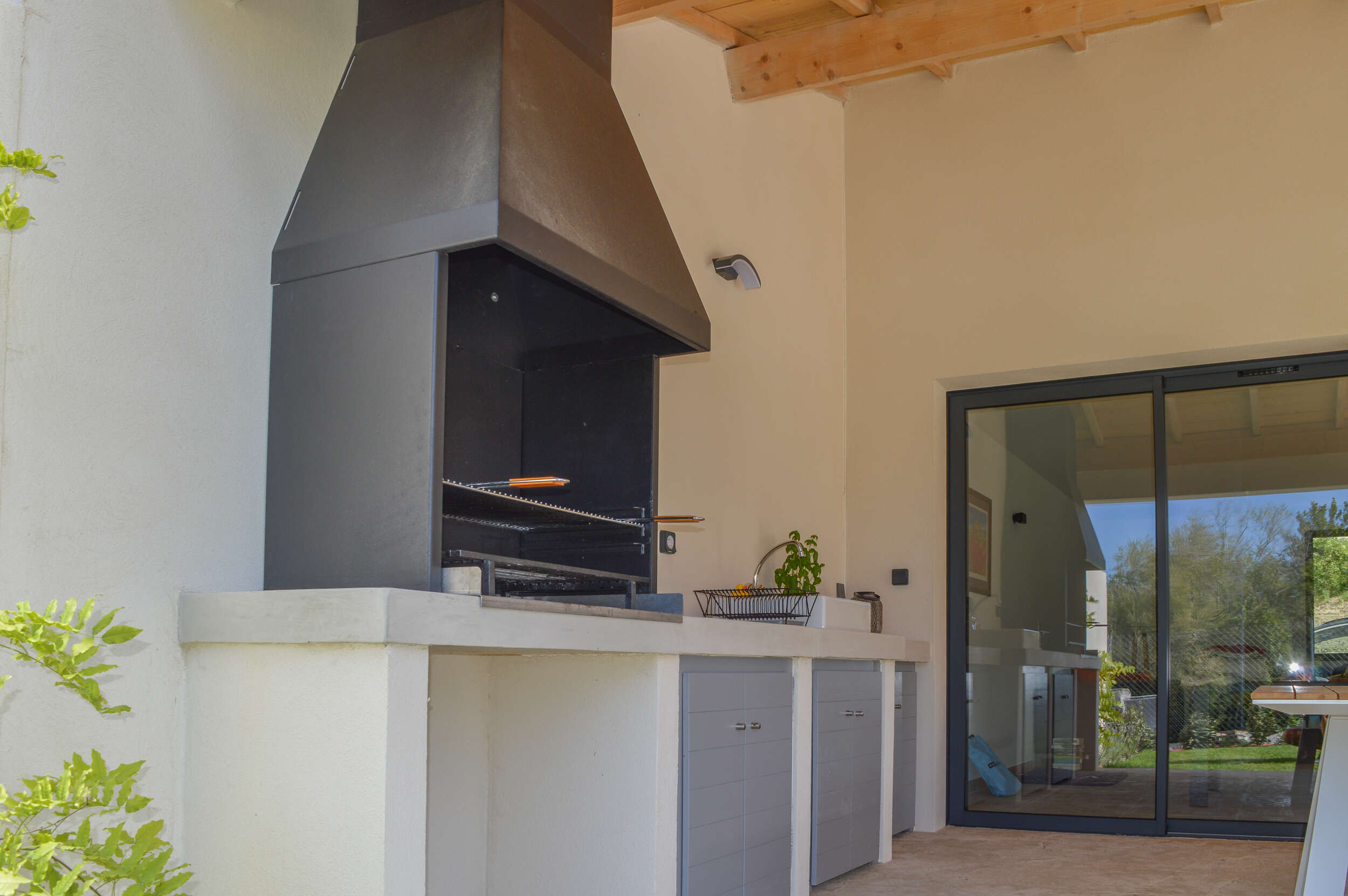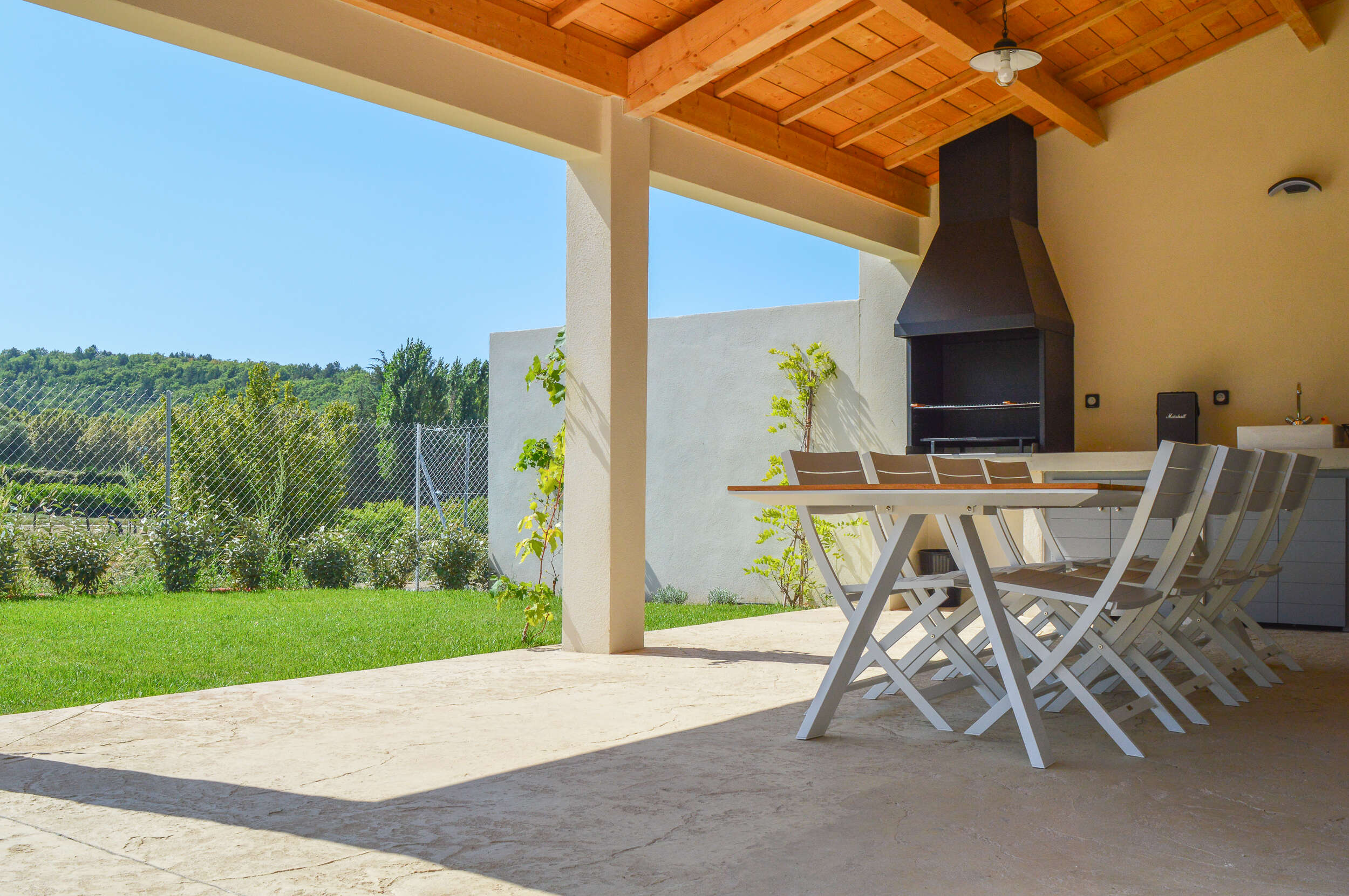 De buitenkeuken met grote barbecue bevindt zich onder het mooie overdekte terras, waar u zalig kan aperitieven en gezellig dineren tijdens de zwoele zomeravonden. Men geniet van een mooi landschap en zicht op het zwembad. Door de tuinverlichting en de verlichting aan het zwembad is de sfeer 's avonds buitengewoon.