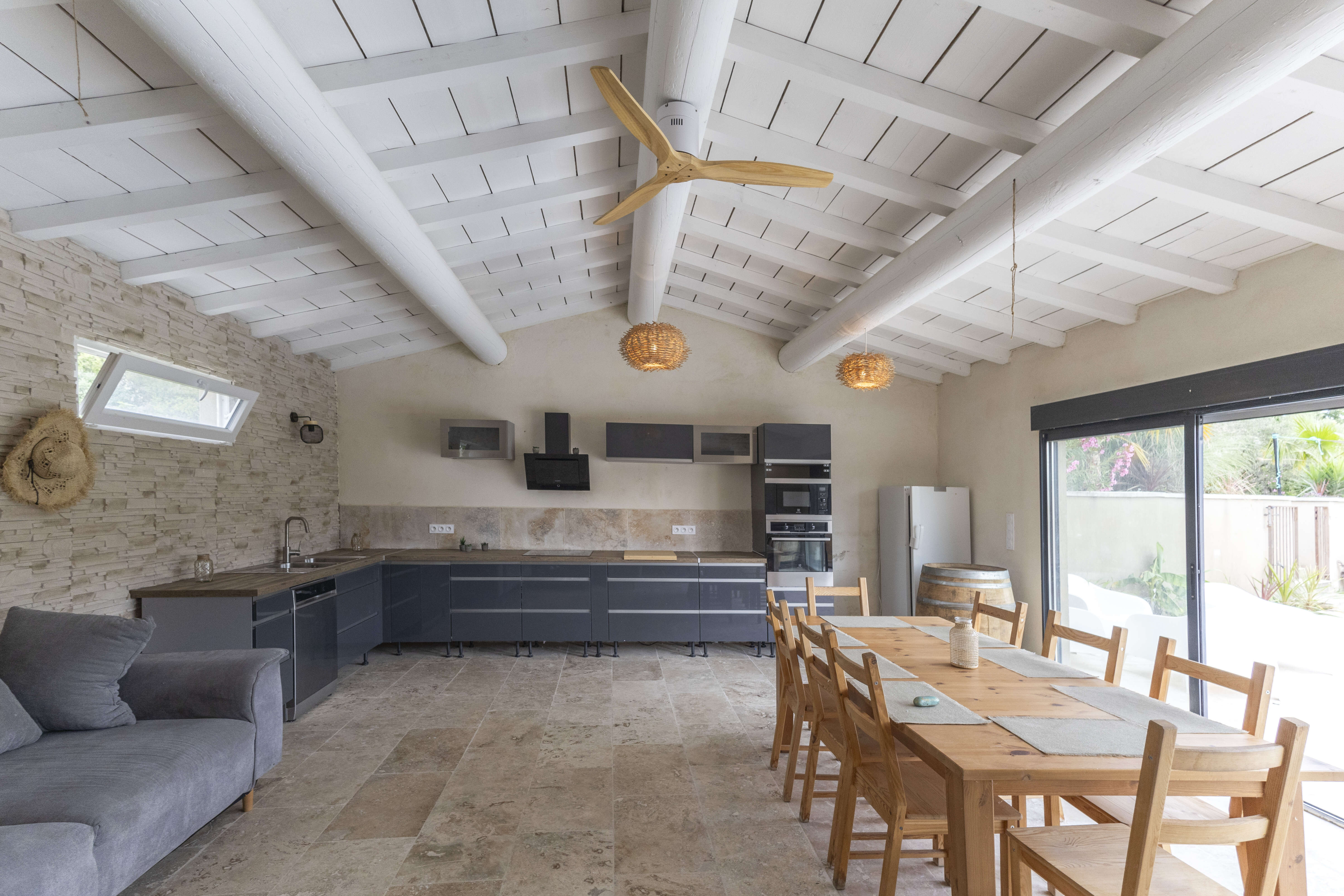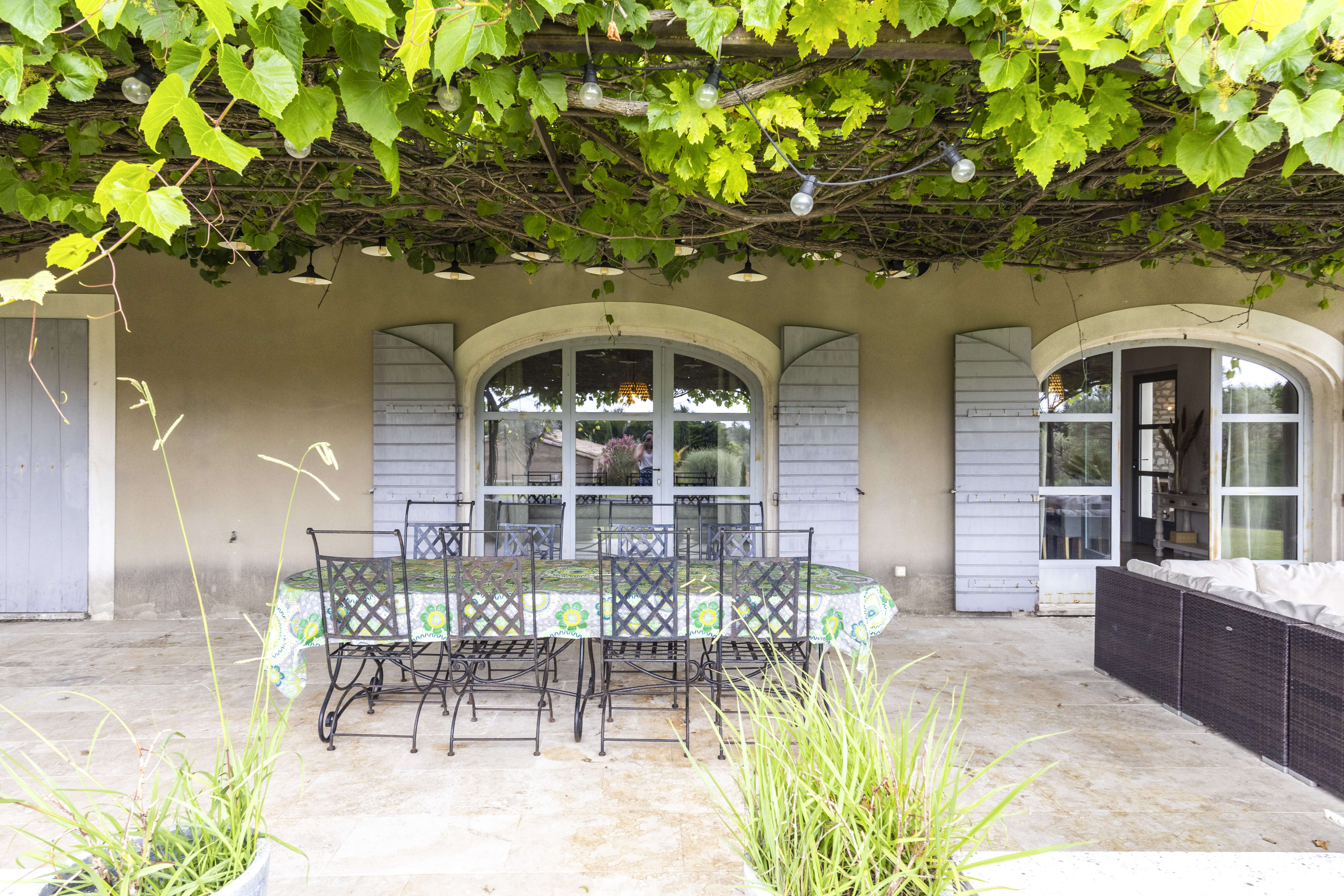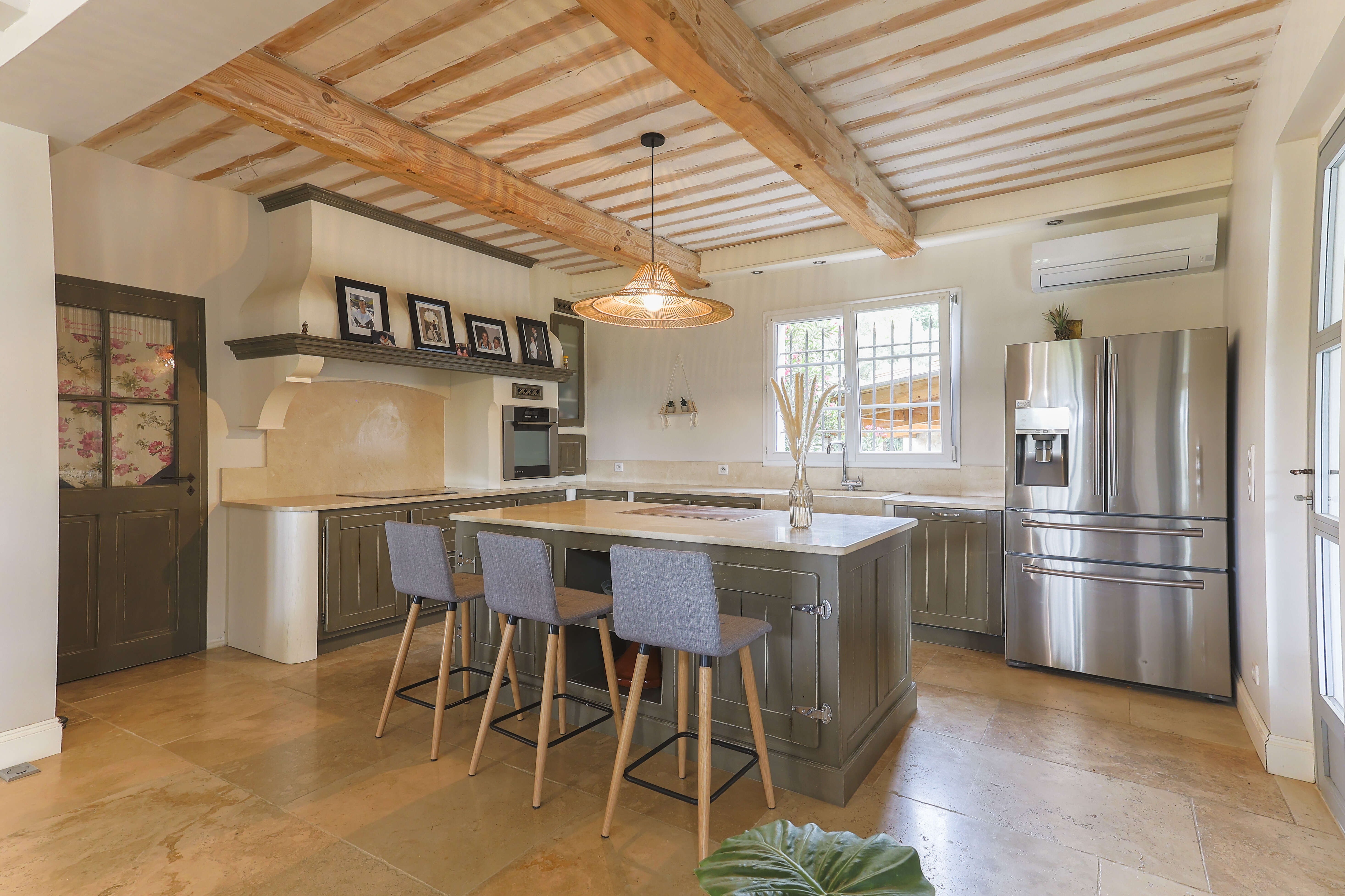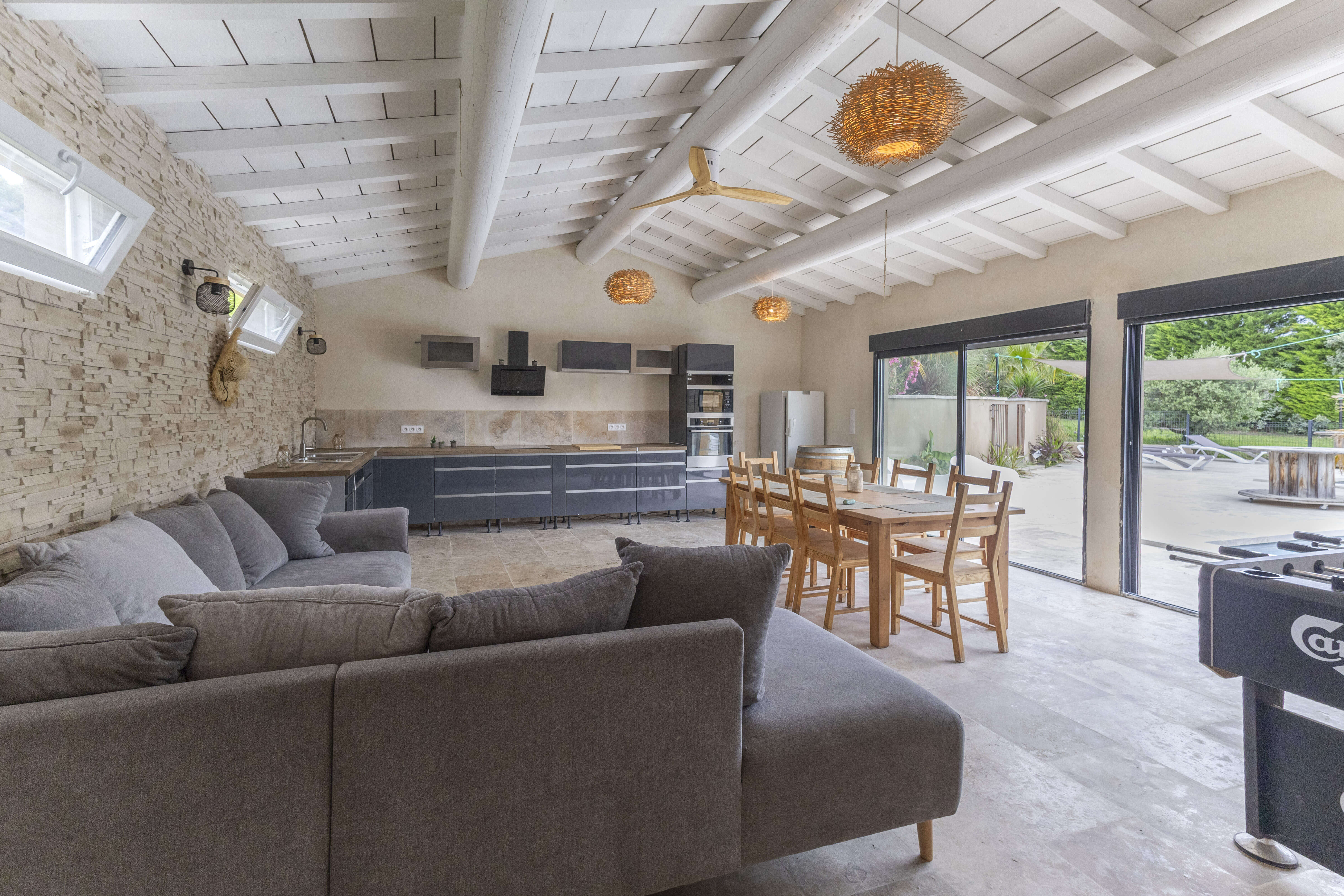 De open keuken en gezellige woonkamer hebben grote vensterdeuren die uitgeven op een overdekt terras met tuinsalon. Alles is voorzien voor een zorgeloze familievakantie in Zuid-Frankrijk. Exterieur – Groot domein met privézwembad
